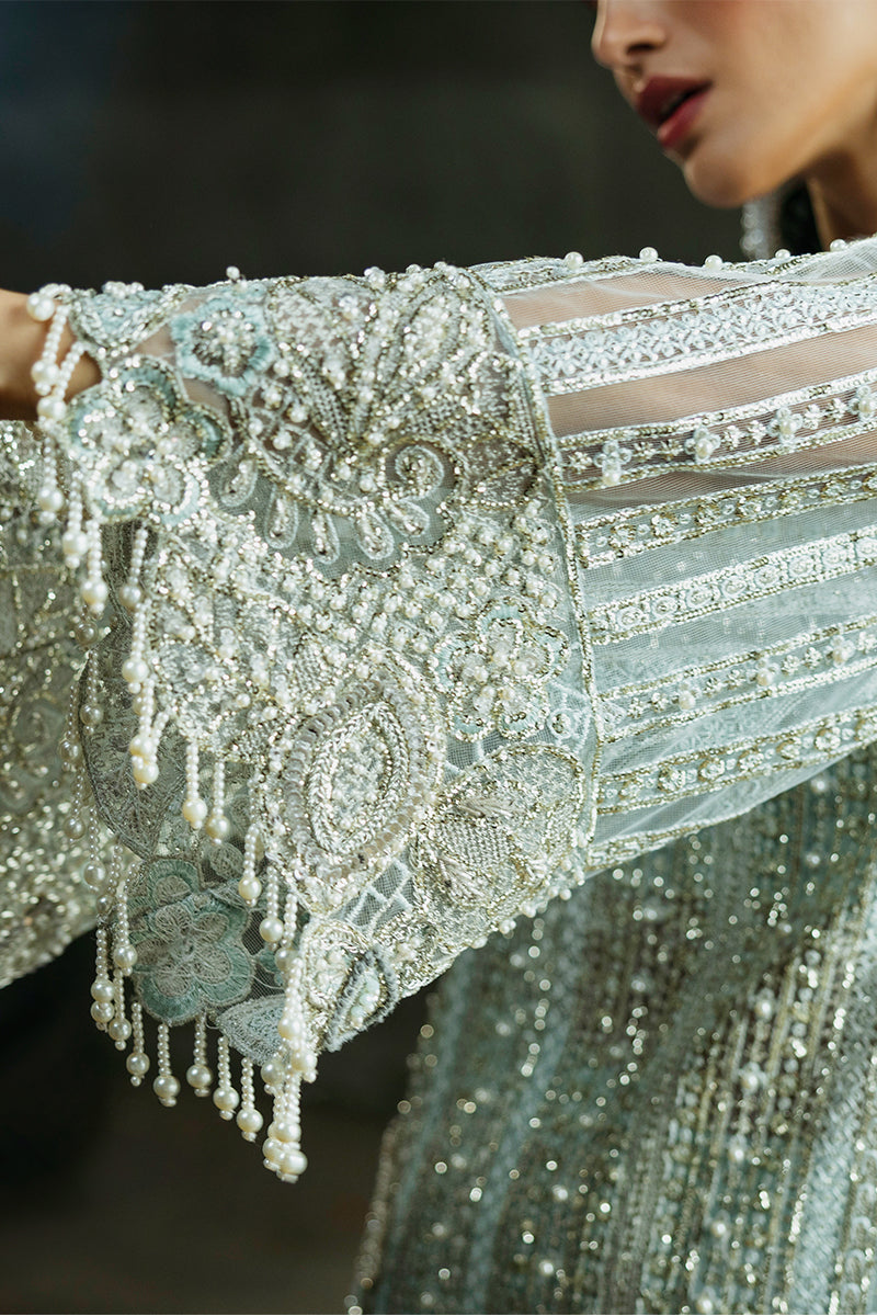 A symphony of elegance and opulence. This stunning design features a meticulously embroidered net shirt, complemented by luxurious raw silk trousers. Paired with a diaphanous organza dupatta adorned with intricate embellishments, Iris exudes sophistication and charm. The perfect choice for making a bold yet graceful statement this season.