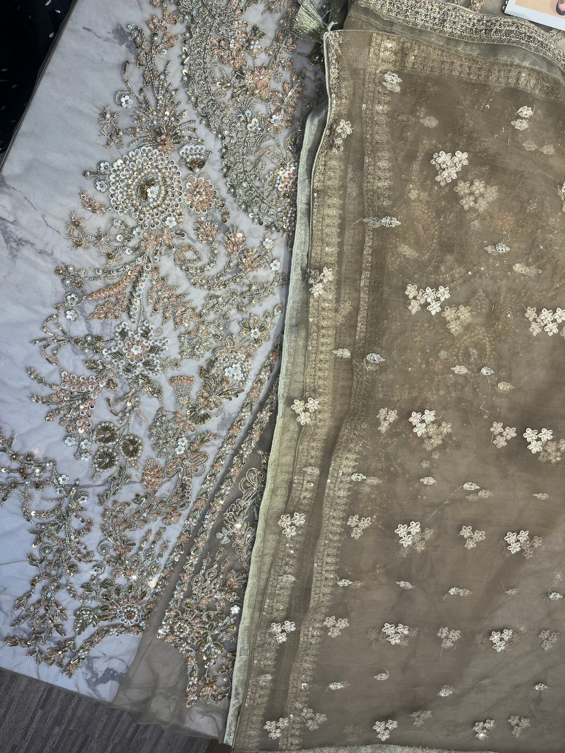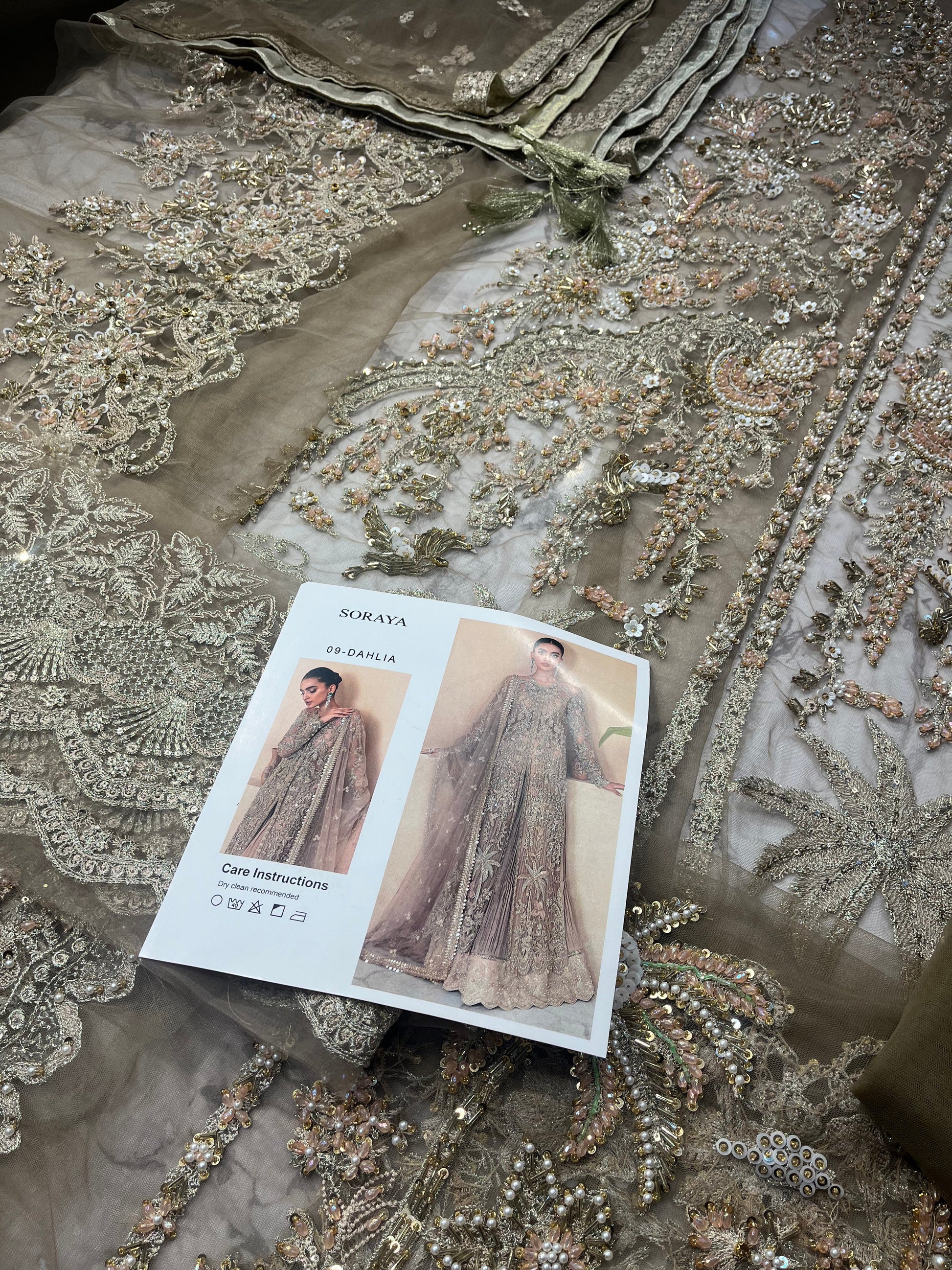 Dahlia is a modern technique masterpiece essayed in dull gold & skin shades curating an enchanted bridal piece. A mesmerizing net gown beautified with multi-hued pastel shaded work ornamented with gangajamni with sheesha details further fused with dabka and katdana work. A ravishing net dupatta modified with sequins laces and striking raw silk crushed pants adorned with organza borders makes it a statement attire for a perfect wedding day.