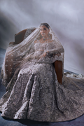 EISLEY, a symphony in grey elegance. Unveil the magic of handcrafted perfection on printed organza canvas with intricate 3D techniques and layered jewel work. The dupatta casts a celestial spell with its starry night effect, while sleeves adorned with hanging tassels add playful grace. Elevate your style with Pareesa, where every stitch is a testament to refined glamour.