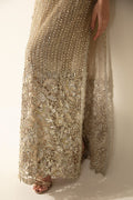 Crafted from a delicate net canvas in a mesmerizing pale gold hue, the pale gold radiant ensemble Eve, is adorned with an exquisite array of crystals, pearls, and swarovski elements. Each element is meticulously placed to create a celestial symphony, transforming the ensemble into a dazzling masterpiece.