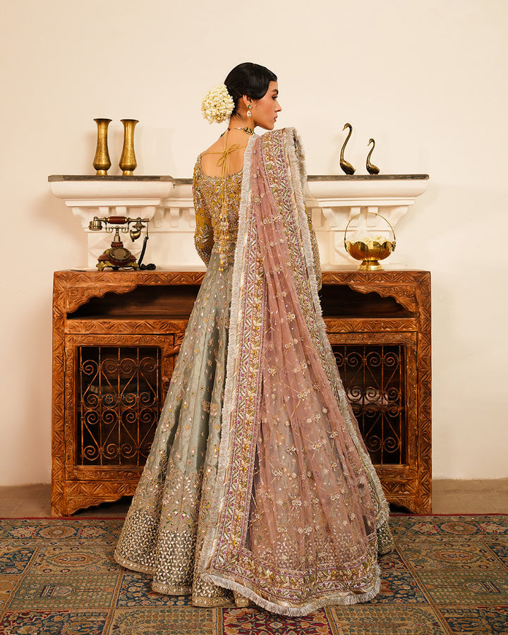 An ode to the Mughals’ love for the summer gardens, Najmeh features a composition of floral patterns bordered by laurel leaves in playful hues, while the lehenga is uplifted by a sophisticated layering of techniques of tilla, naqshi, gota and resham. This ensemble is paired with an embellished net dupatta. Rooted in vintage glamour, Najmeh is the ultimate in festive luxury.
