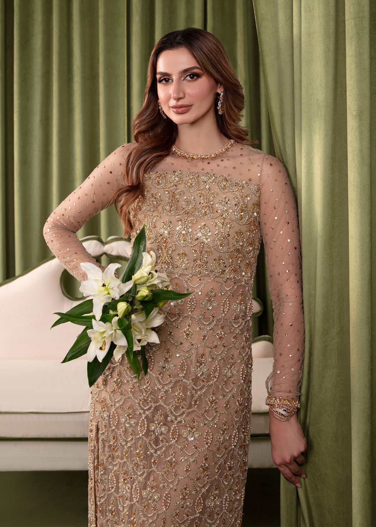 Prepare to dazzle in sheer elegance with this breathtaking nude net long shirt, a masterpiece of refined sophistication. Every meticulous stitch adorns its embroidered base, elevating your style to new heights with exquisite detail. Delicate embellishments and scatter spray sequins add a captivating sparkle, while the see-through sleeves and neckline lend a tantalizing allure. Paired effortlessly with Korean raw silk trousers in a matching shade, this ensemble exudes effortless chic, with side seam tissue detailing adding a touch of texture and dimension. Get ready to command attention and turn heads wherever you go with this stunning ensemble that effortlessly blends understated glamour with refined elegance.