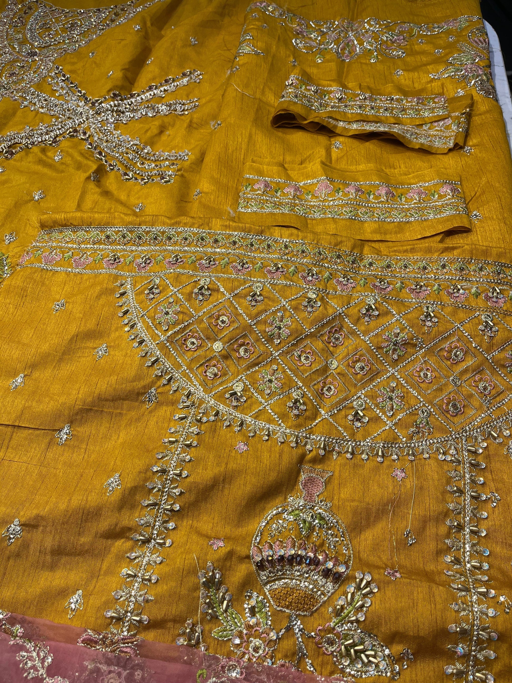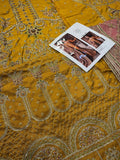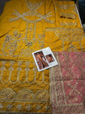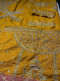 Gul-e-Maryam is our marigold yellow ensemble that will be an absolute treat to eyes and will lend you that perfect festive look. The peshwas is adorned with interacted metallic embroidery featuring floral motifs and sweeping archway patterns taking inspiration for Mughal architecture.The ensemble is paired with duo of dupattas one in shade of blush plink made of jacquard and graceful adorned with embellishments all over and encased in broad embroidered broader on all sides. The other dupatta balances the ensemble with simplicity offering diaphonous matching marigold dupatta with blue ends also adorned with light embroidery that will surely make you Look all pretty and glamorous