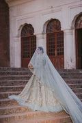 Ice-blue organza pishwas and duppata paired with tissue lehnga(Net frills attached at the bottom) Embellished with golden and silver mix tones.
