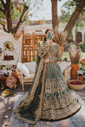 Its a bottle green romani silk choli and lehnga with net duppata. Heavily gold embellishments with gotta work along with shocking pink and orange resham