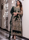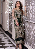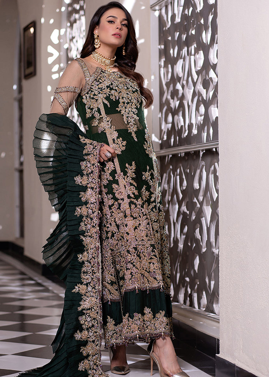 This Jade attire is a statement maker with pure net sleeves adorned with uniquely crafted handwork on the Foot Long shirt with heavy motifs on the fringe of Frill Dupatta.