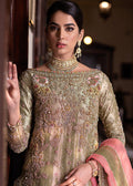 Moss Fantasy is a classic Soft Green toned Outfit designed with delicate embroidery in a floral patterns on Tissue shirt decorated with Tassels along with Dupatta with heavy embroidery on the brink of Garara.