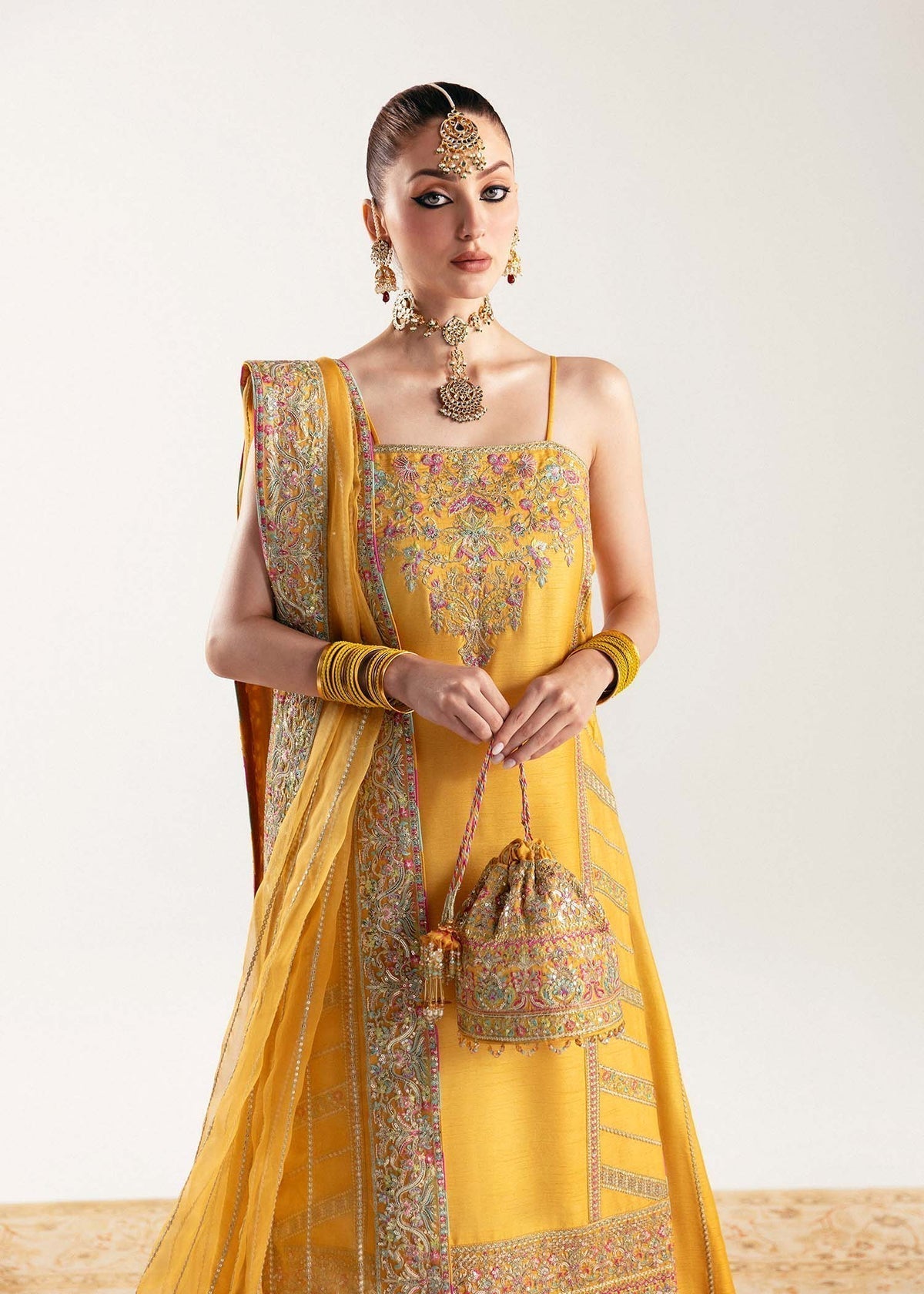 sunny yellow, intricate embroidery, and the graceful sway of organza
