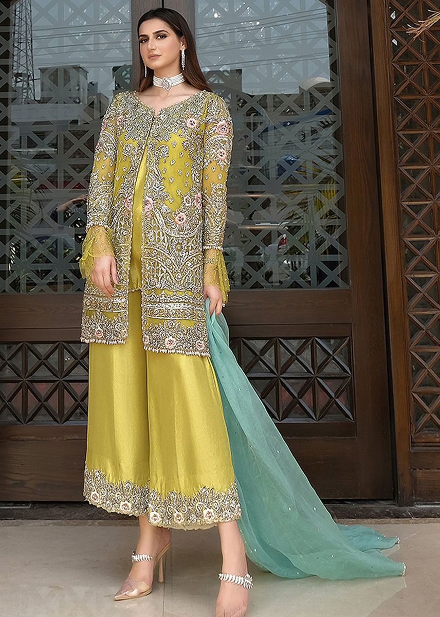 Lime yellow open shirt embellished with indicate sliver threadwork and floral embellishments.