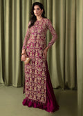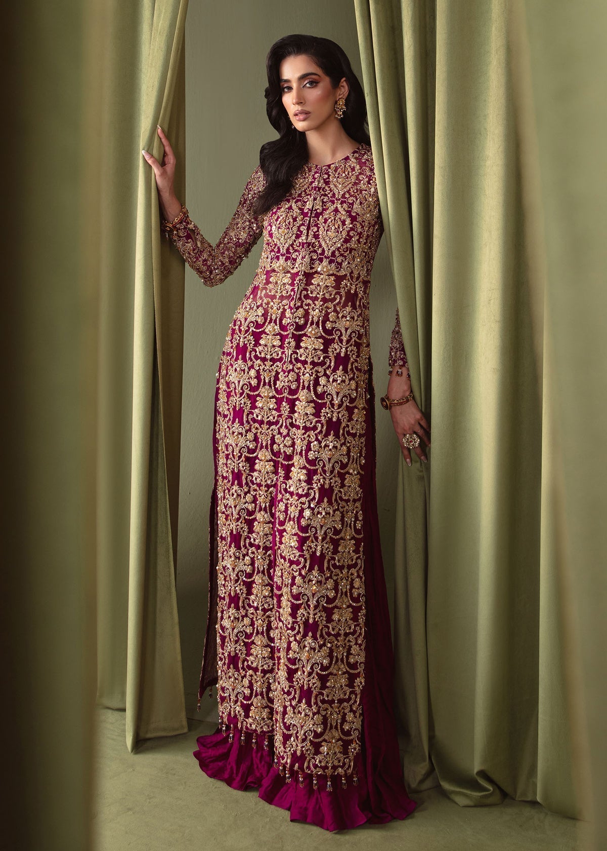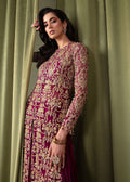 Immerse yourself in a world of bold hues and striking elegance with this exquisite plum dress. Its organza base is adorned with delicate embroidered motifs, reminiscent of precious jewels, while lavish gold embellishments add opulence and glamour. Picture intricate patterns glimmering in the light, commanding attention wherever you go. Paired with crushed pants, it forms a harmonious union of boldness and beauty, sure to leave a lasting impression.