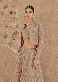 Yellow Golden master pc Lehenga Choli Dress Indian Bridal Wear is heavily decorated in golden white extensive worked open shoulder blouse paired with self-brocade panel lehnga with beautifully embroidered entire ghair in shades of ivory blossom pink and golds in traditional Organza fabric and Net Embroidered Choli. Your next wedding outfit is waiting for you. Golden Lehenga Choli: Take all the guests' attention with your exquisite look with one of the best master pc outfits of saira shakira . Comprising of a Golden organza round neckline blouse with complete zardozi work. This exceptionally embellished choli is paired with a jacket outfit which is organized with a fawn organza base choli which is sprayed with sequins glorifying its grace. Golden organza choli is emphasized with floral bunches done with kora, dabka, tilla, and sequins work. Making it true that you can turn all the heads around with your gorgeous ability to wear the outfit in a way that is spectacular. Golden Lehenga: Elevate your style this season with our fashion-forward designs. An artistic vision of classic style and luxurious detailing, transpire into a truly romantic and iconic bridal for your big day. An eye-captivating long silhouette is fully illustrated with antique embellishments all over. Furthermore, it is emphasized with an embellished waist belt and scalloped borders. Compliment the look with a wide-flared lehenga. The combination of gold work on organza is absolutely breathtaking in its amazing Style. The Lehenga incorporates beautifully designed borders having sprinkled sequins to give it a perfect maharani look. Bridal Dupatta: An artistic vision of classic style and luxurious detailing transpires into a genuinely romantic and iconic bridal wear for your big day, which will complete in this beautiful golden lehnga choli paired with a net chiffon dupatta.