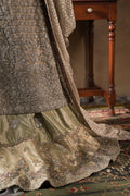 The perfect look for a Classic Reception bride. Soft champagne, silver and mint green are blended in harmony, decorated with dazzling silver and gold zardozi embellishment for a stunning effect. Signature 'jhaalar' motifs with French knots and dapka add a delightful femininity. Purely handmade, this heirloom creation is sure to be cherished for decades to come.