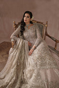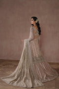 The concept of bridalwear is constantly evolving, but very few seem to understand the needs of the modern bride quite like AMMARA KHAN. This set includes an ivory net shirt fully worked in delicate zardozi and resham work, paired with a soft blush 'Lehnga' with an intricate, heavily embellished floral border. A rich silvery silk tissue dupatta is crafted with an all over jaal and rich four sided borders. Delicate sheer sleeves are heavily embellished to perfection. Regal, modern and timeless.