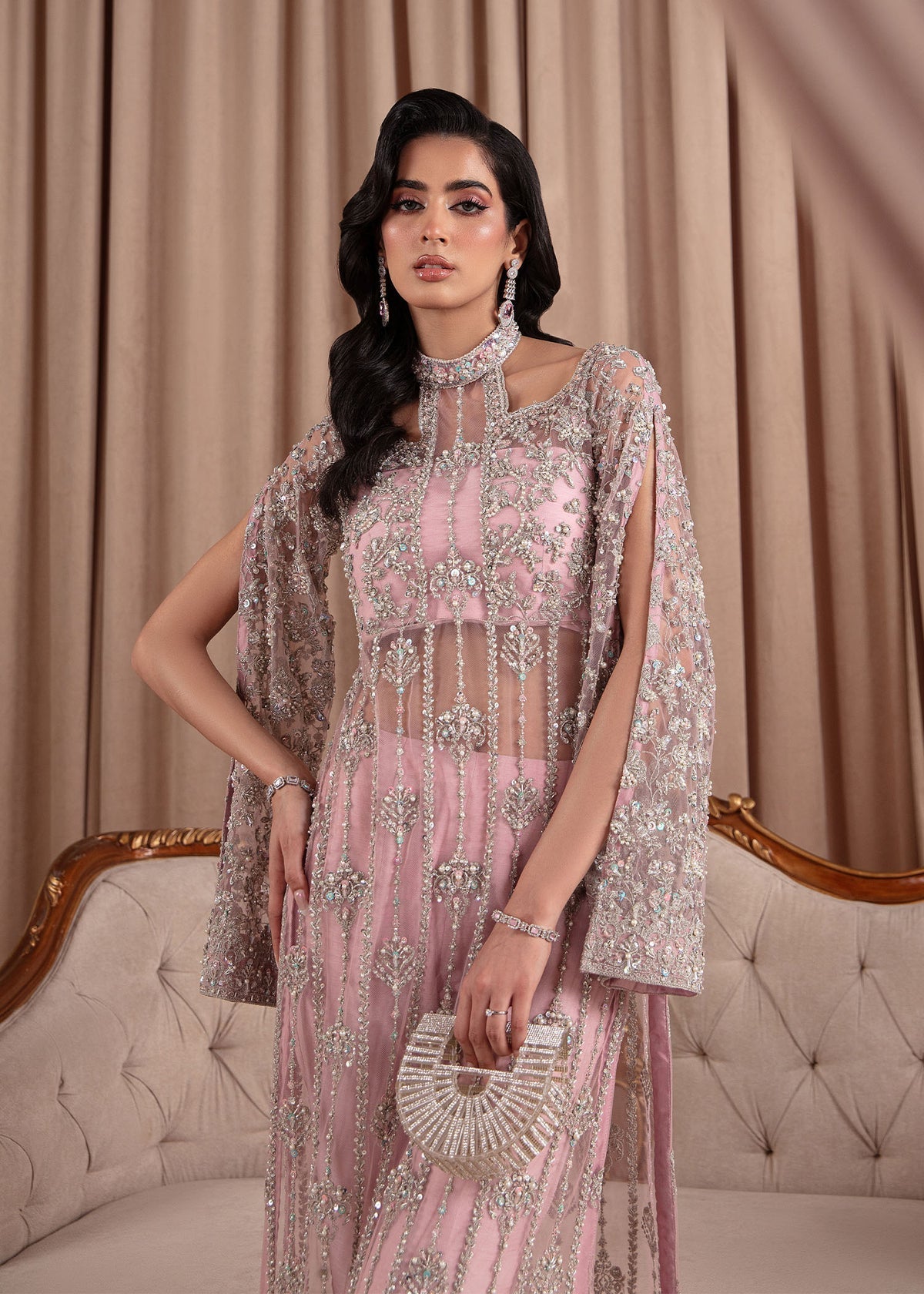 Step into a world of enchantment with our mesmerizing pink ensemble, a true epitome of elegance and luxury. Adorned with intricate silver embroidery on a soft pink base, this attire is a celebration of unparalleled artistry and refinement. Every stitch and embellishment is meticulously crafted, ensuring a breathtaking display of beauty from every angle. The delicately drooping sleeves add a touch of ethereal grace, enhancing the ensemble's whimsical charm. Paired effortlessly with sleek cigarette pants, this ensemble exudes timeless sophistication and captivates with its enchanting allure.