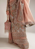 This regal outfit rendered in a beautiful shade of Pink on an organza canvas for shirt and Raw-silk palazzo, with heavy embellished motifs along with intricate details. The timeless look is completed with an organza dupatta along with four side heavy embellished borders with 3 different corner motifs embellished with sequins, cut dana and with nakashi, dabka concluding the look marvelously.