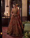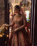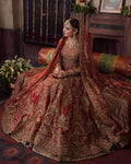 A three piece deep red pishwas bridal set hand worked by artisans to create lotus blooms, floral bouquets and vases on a sumptuous tissue fabric.Handcrafted with meticulous care, our pieces have a lot of diligence and love invested in them. The exquisite craftsmanship requires laborious hours.